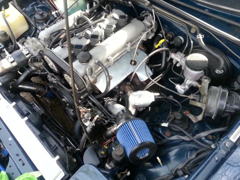 - Aem Blue DryFlow air filter with silicone adapters and t-bolts to turbo inlet
