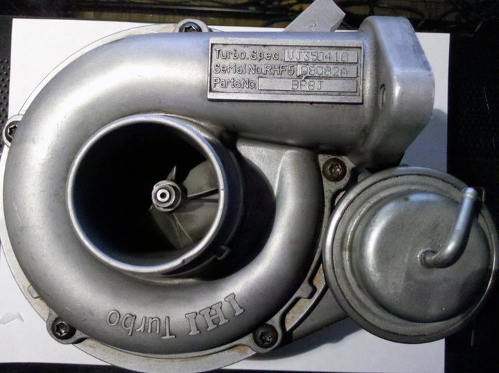 IHI RHF5 turbo, internally wastegated to 8psi. No burning oil, normal shaft play, no compressor or turbine wheel damage.