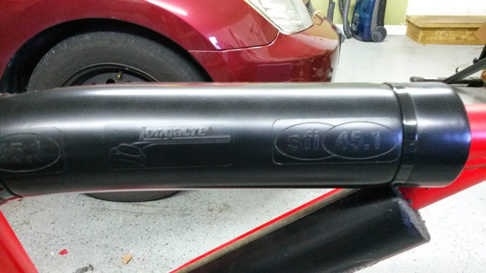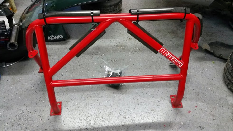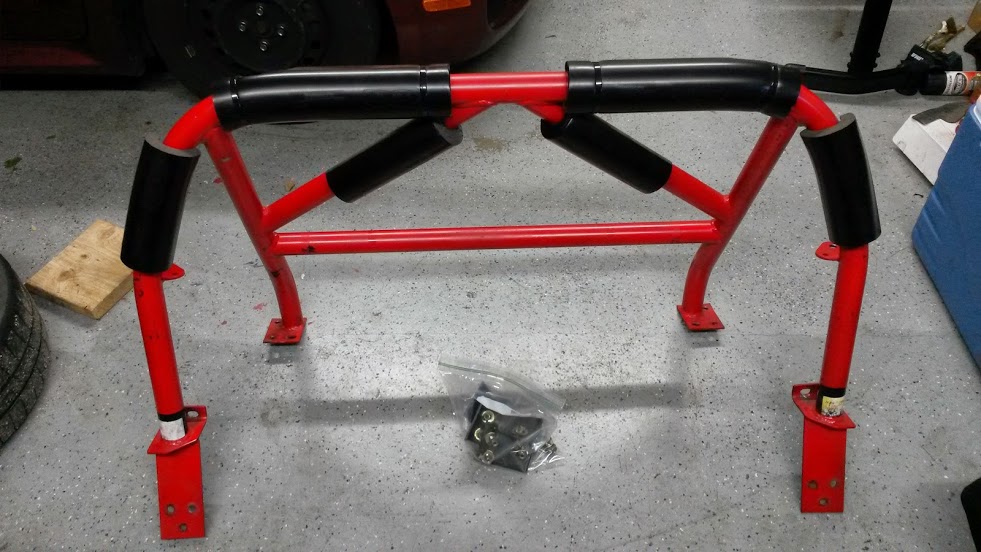 I sprayed this bar red - some of it has rubbed/scraped off in various places to show the original black. Hardware/backing plates come with. SFI padding comes with and has been trimmed to not rub and squeak against the hard top. Green zip-tie comes with.