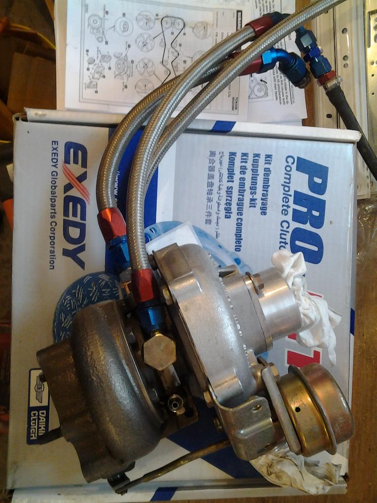 GT2560 turbo (AKA SR20 turbo) with T25 flange. It has all the oil lines and special fittings that are need for all the hoses. The oil supply line is in included but not shown. This turbo was was idled in the garage. Obviously no shaft play