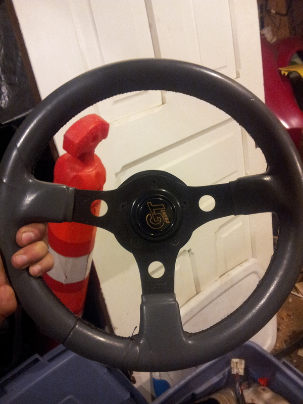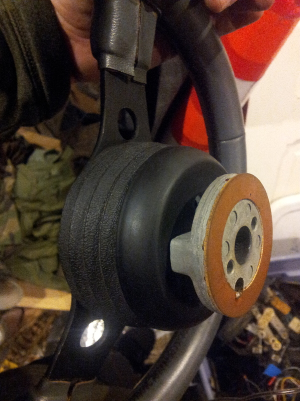 I dug out the steering wheel. Unfortunately I noticed the horn button got cracked at some point. The hub seems to be of good quality (heavy metal, heavy rubber). The cracks in the vinyl are visible.