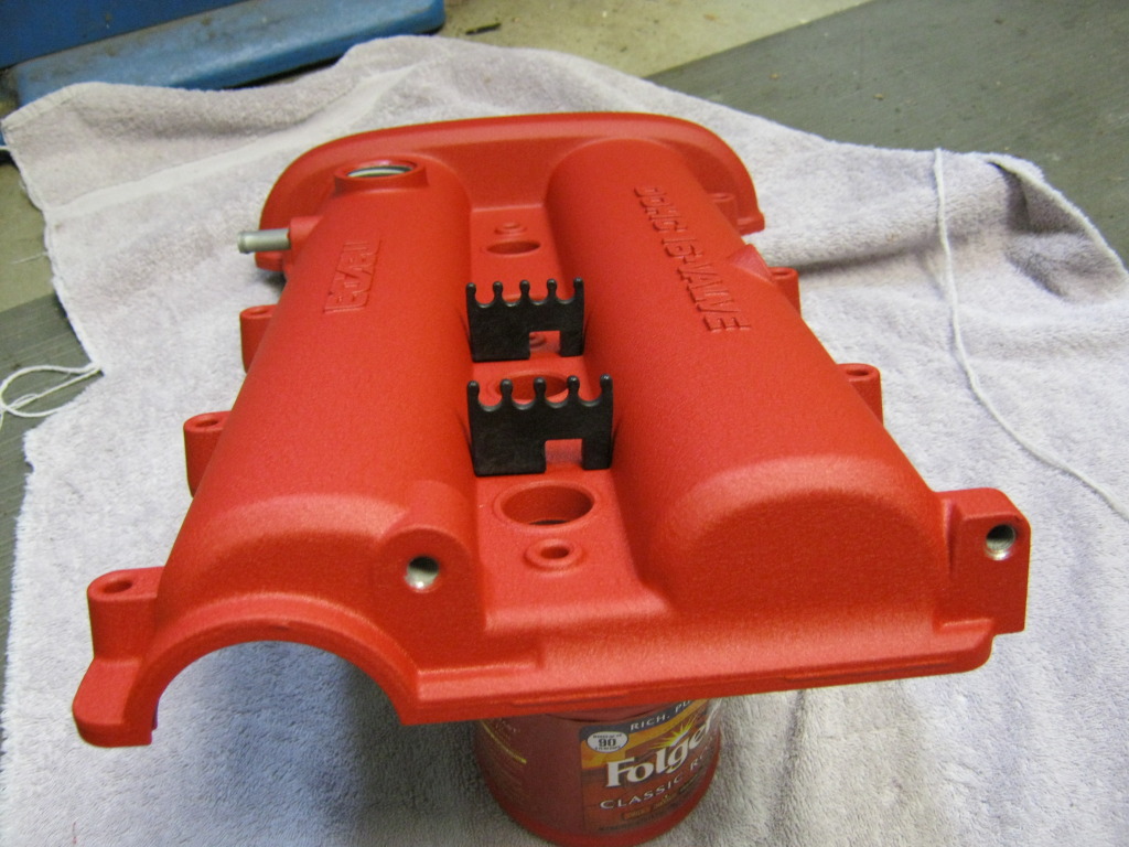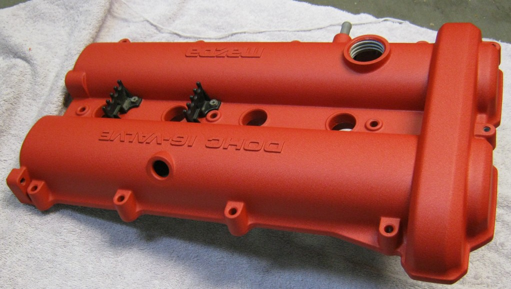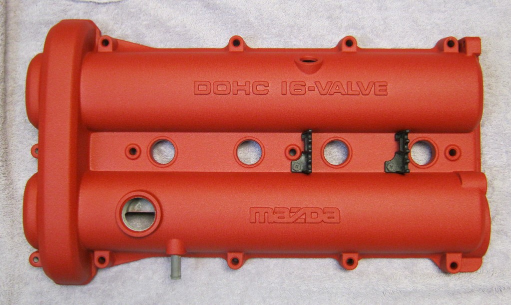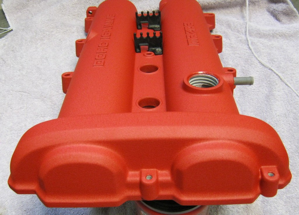 The valve cover has the cast raised “DOHC 16-Valve” and “Mazda” letters. I left them powdered, but could be easily sanded if you want them to stand out.