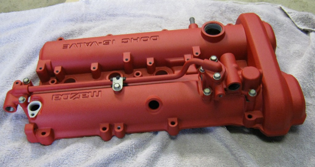 Miata VVT Valve cover. Red wrinkle powder coat finish. This valve cover was disassembled, the aluminum parts sent out to a machine shop for cleaning, then powder coated red wrinkle. The valve cover, oil feed tube and cam actuator housing were all cleaned and powder coated. The steel oil vent covers were removed, cleaned and re installed. No nasty gook hiding anywhere, it's ready to install and make your engine compartment look great!