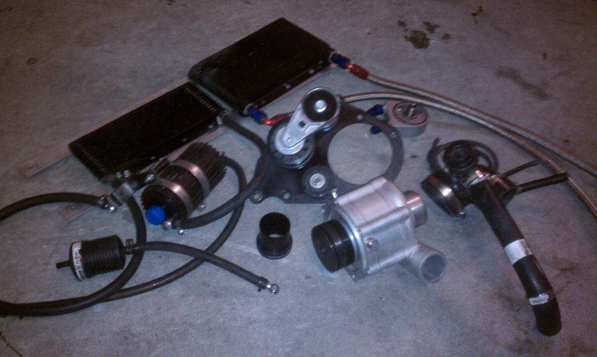 Blower/resevoir/cooler and mounting hardware; inlet restrictor; 70mm and 88mm pullies; IC & piping; 450cc injectors (still in car so not pictured); and engine oil cooler/lines/sandwitch adapter.