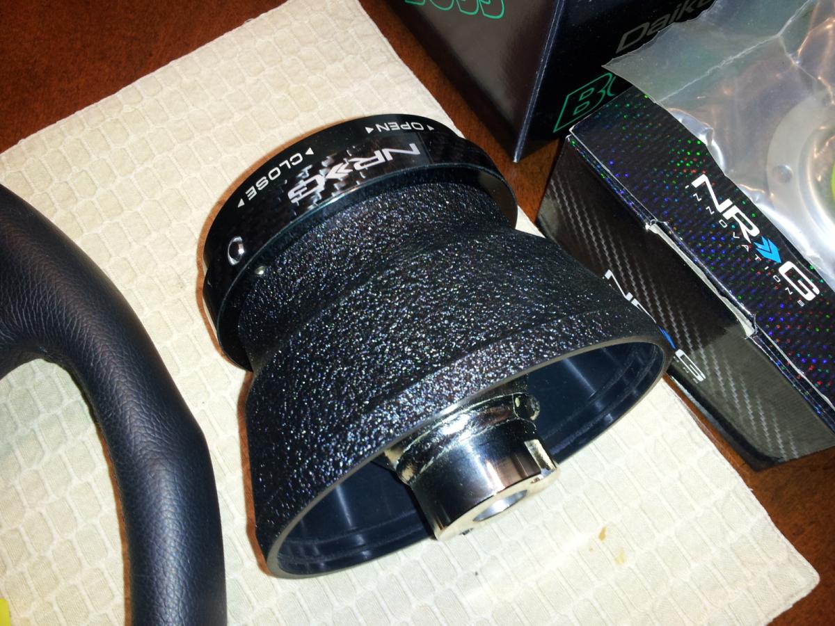 Wheel is a momo monte carlo 350mm, hub is a daikei plug & play hub for 99-00 (possibly 01-05?) with airbag terminator. Quick release is an NRG innovations thin style quick detach in carbon fiber.