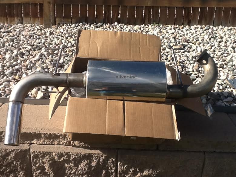 Enthuza Muffler, 2.5" in/out - not too loud, sounds nice, has a silverline can, $199