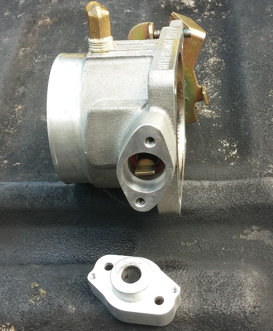 BBK 75mm throttle body, came from FFS as part of their big throttle kit. Per the BBK part number, the original application was 4.6 Mustang. Has what looks like a 3/8" NPT fitting tapped into the top, could be used for idle control or could be plugged. Also has an nicely milled aluminum adapter plate that appears to adapt a Miata TPS to the Mustang throttle (personally I would just use a Mustang TPS because if you need this throttle, you already have a MegaSquirt that you can calibrate for a Mustang TPS).