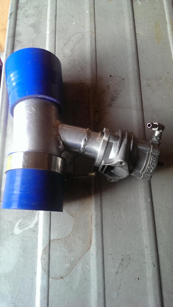 Blitz BOV, has a stiff spring in it, if running below 15psi-ish, I would cut it shorter. Comes with pipe and flange welded to it for plug-n-play =)