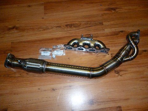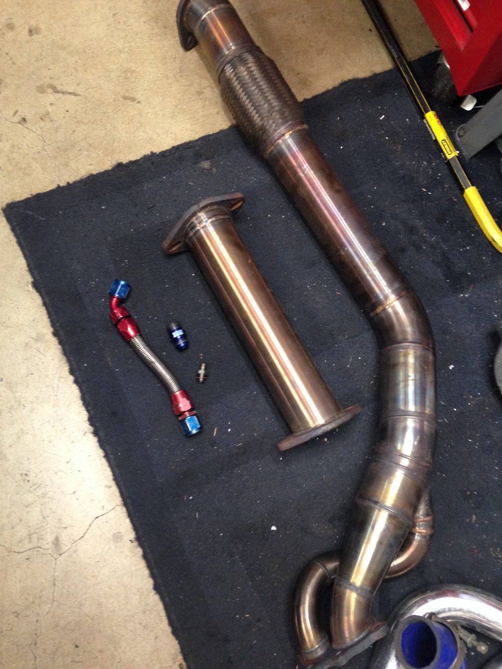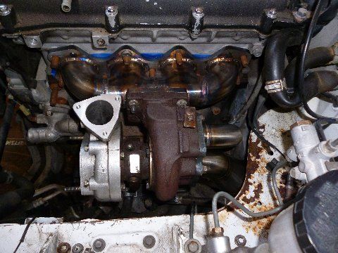 Included will be an Artech log manifold, with a new 1/2" flange welded on, drilled and tapped for TSE inconel studs, with a curly rebuilt SR20 turbo, and a separated gas 3" downpipe, with 3" test pipe as well. I'll also include the home made turbo crane, I'm not sure how much it helps, but any little bit counts. It also shields the dip stick from the turbo heat. It'll come with the SS oil feed line, adapter to thread it into the block, and SS 10-AN drain. I'm not sure yet if I'll include the heat shield, but it probably won't fit with my new turbo set, so if you want it, it's yours. Also included are 2 push-loc fittings for the water lines, and both flanges for the inlet and outlet of the compressor housing.