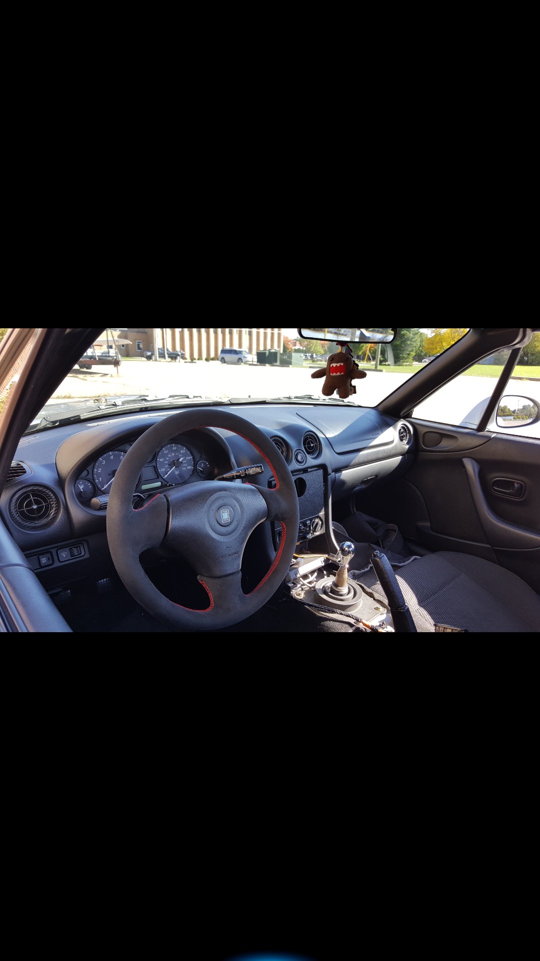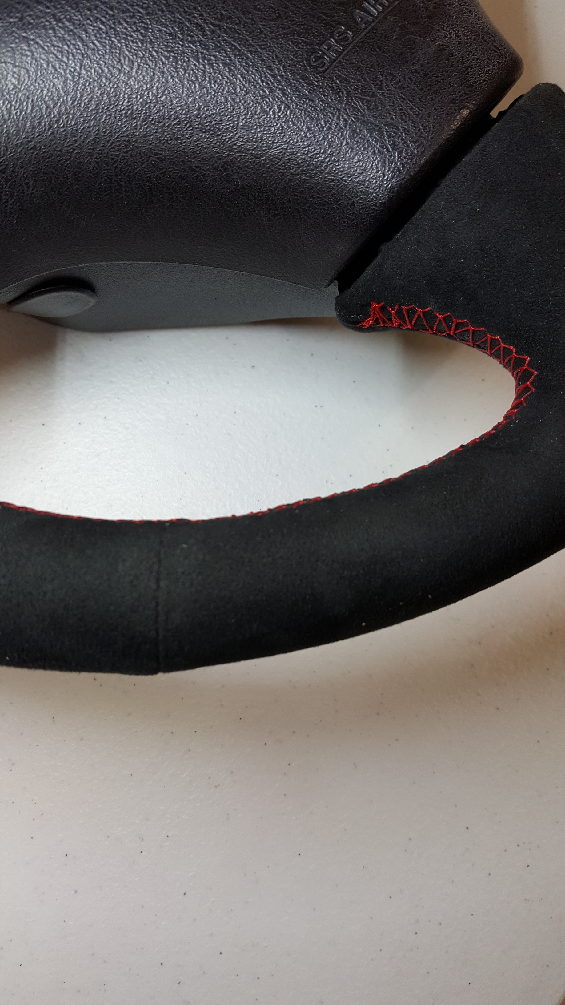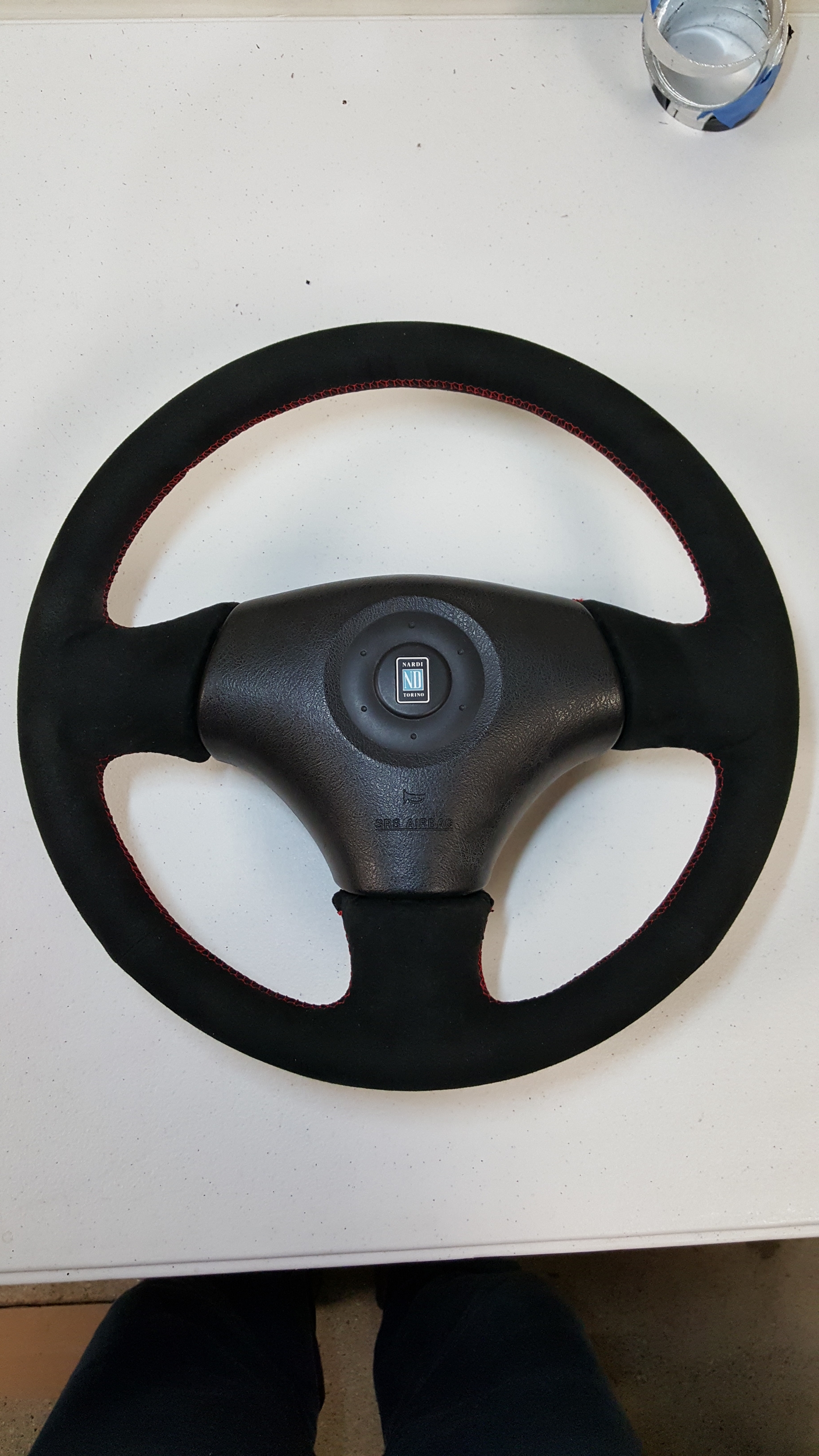 This was my original '99 nardi steering wheel. I sent it in to Redline goods to be wrapped in black suede with red stitching. They also added a small layer of padding so its slightly thicker than a factory wheel.