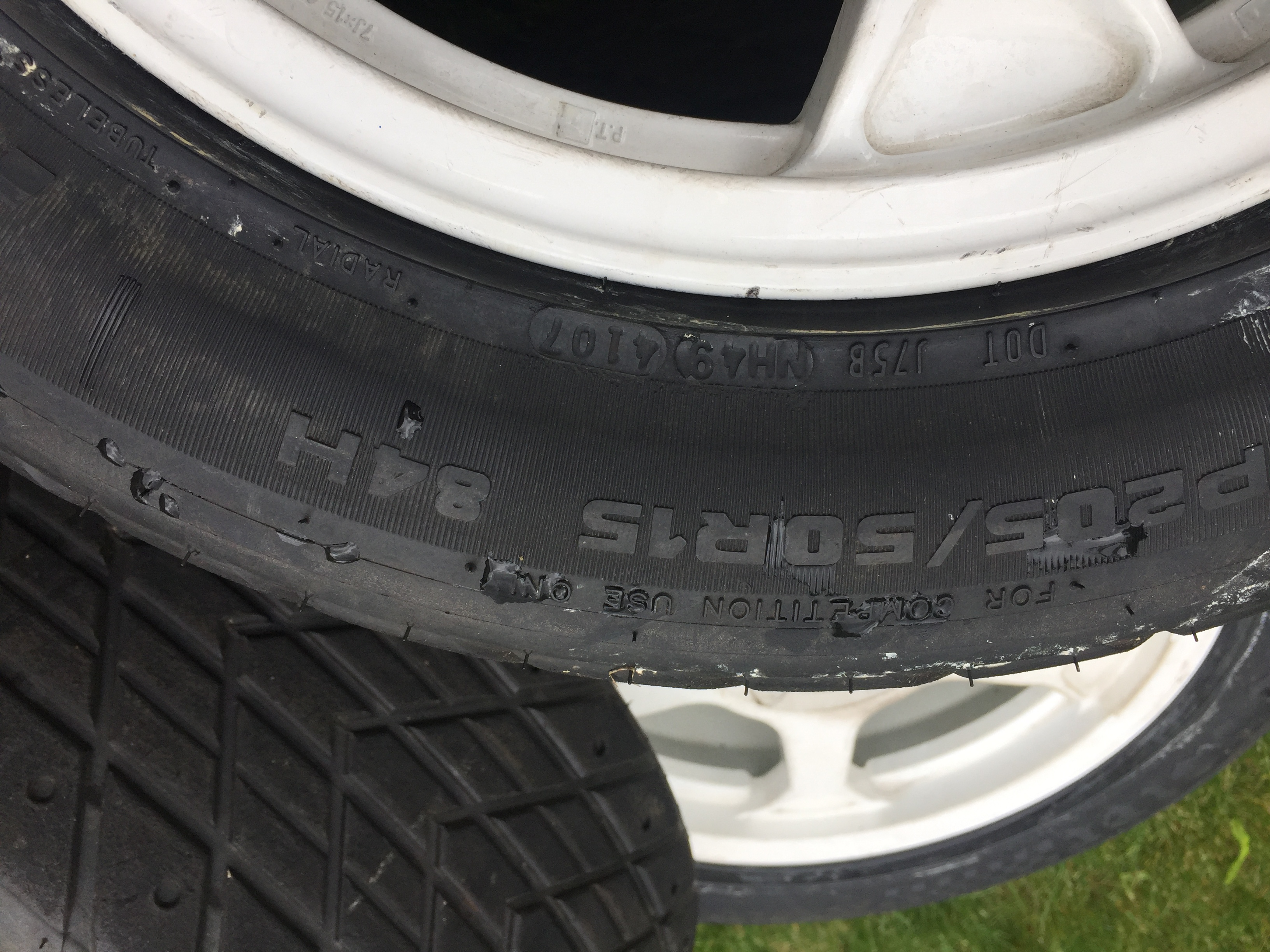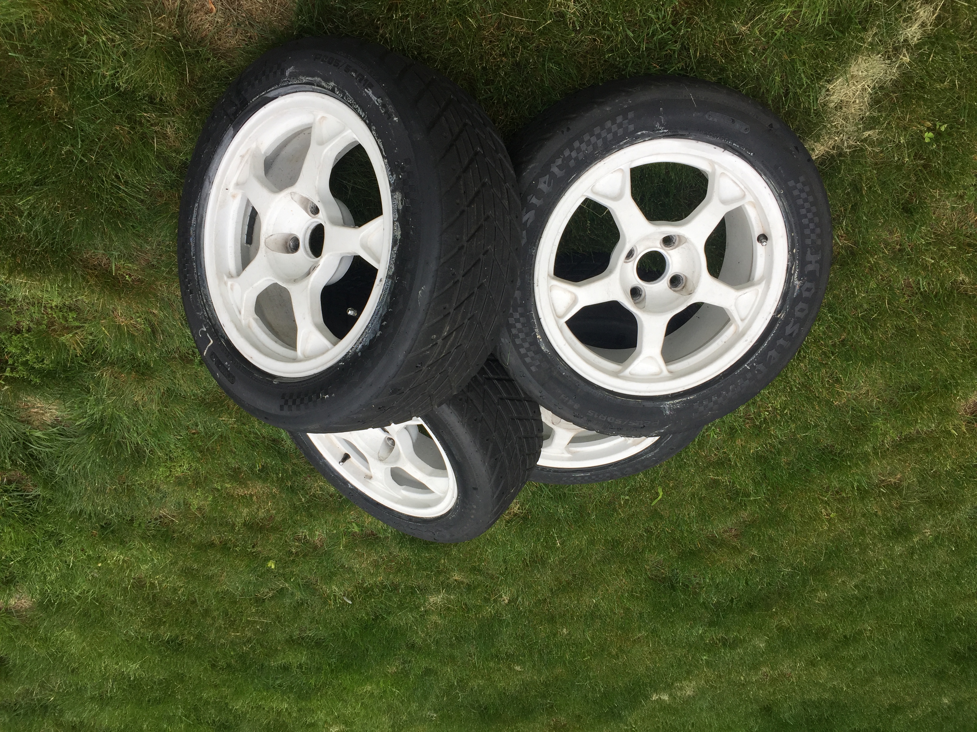 I bought these used a year or so ago and have never actually run them. The tires have obviously been run in the past but likely not too much. The wheels are white and have plenty of blemishes as these were on a spec miata race car. I have upgraded the brakes on my car and these no longer fit. $375 obo
