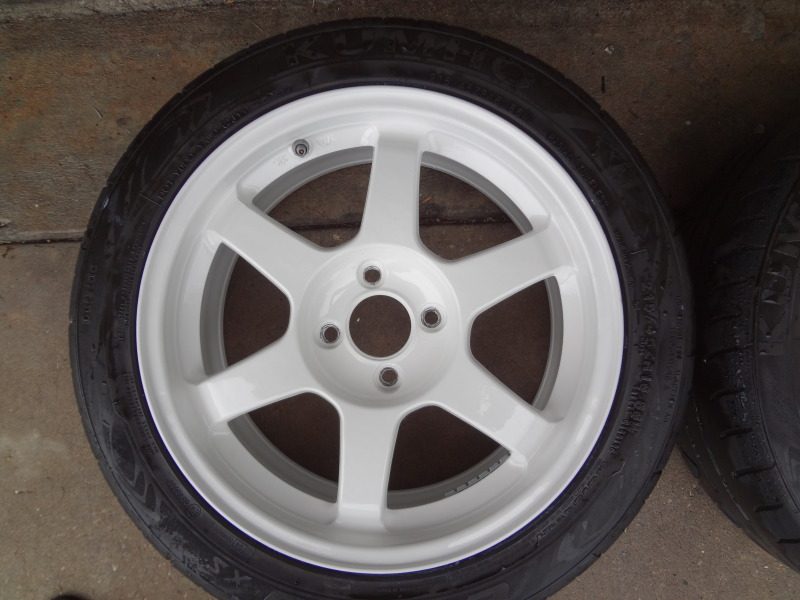 Volk TE37, 16x7 +42 offset. The wheels are in great shape and have been freshly powdercoated white.
