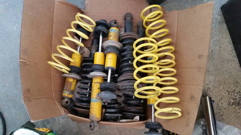 Bilstein hd performance shocks and apex springs. No idea on the mileage. They were included as uninstalled parts when the car was purchased.