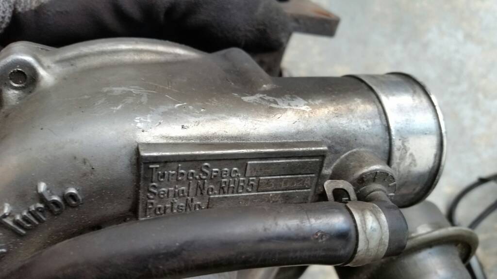 Older (pre internet) IHI rhb5 turbo. T25 (I think) inlet, 5 bolt outlet, water and oil cooled. Internally gated @ 8psi. I can't find specs for this thing otherwise, but it works. No shaft play from what I can tell. Probably needs to be rebuilt. Was spooling slow, but was spooling when I bought the car.