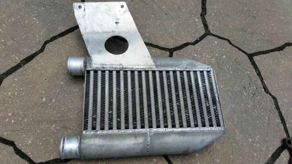 Small BEGi fmic. 2" inlet and outlet on the left side. Leaves tons of room for air to hit the radiator, and is barely visible from outside the car. Mounts behind to the OEM hood latch location. It does have a cracked in the mounting plate, so it would need to be welded before it gets bigger and breaks off from heat/vibration.