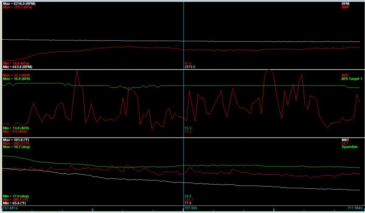 Here is just cruising, and you can see my AFR all over the place. How can you dampen the curve? I have put in the 0-5v settings in the project calibration. Its a Innovate MTX-L. Their documentation says 0v -> 7.35 and 5v -> 22.4. Should i adjust, or is this something i can fix by doing an open air recalibrate?