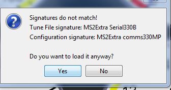 do I want to load anyways? I say "Yes" then i get a prompt stating that it will load settings from the 1 1992 Miata.msq and current tune.msq will be updated with the new setting. Click "Yes" to proceed