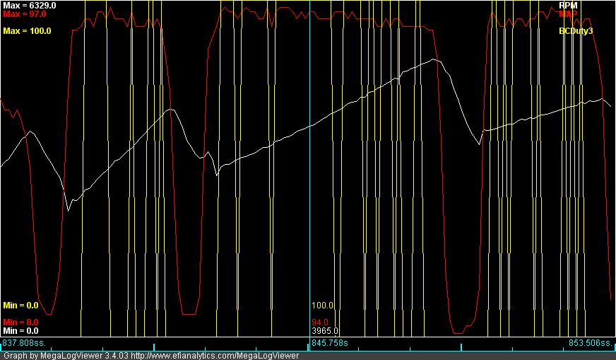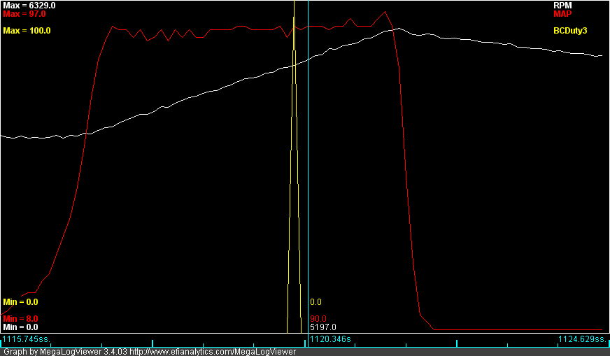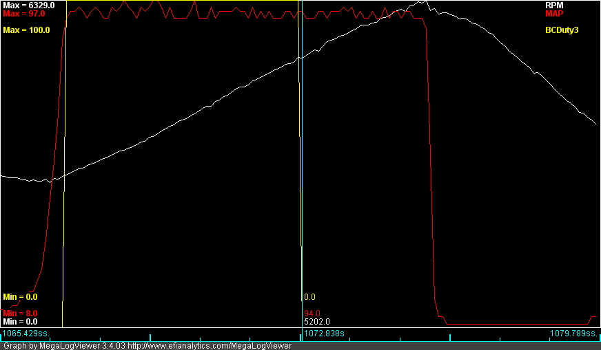 In this pull, I keep MAP well above 90kPa and get a nice switch at 5200RPM: