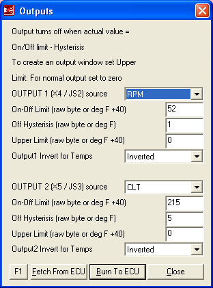 Now I go to the Outputs dialog to setup Output1. It wants the value as a raw byte (0 to 255) even when I setup RPM as the source. Anyone know the conversion from RPM to the raw byte?