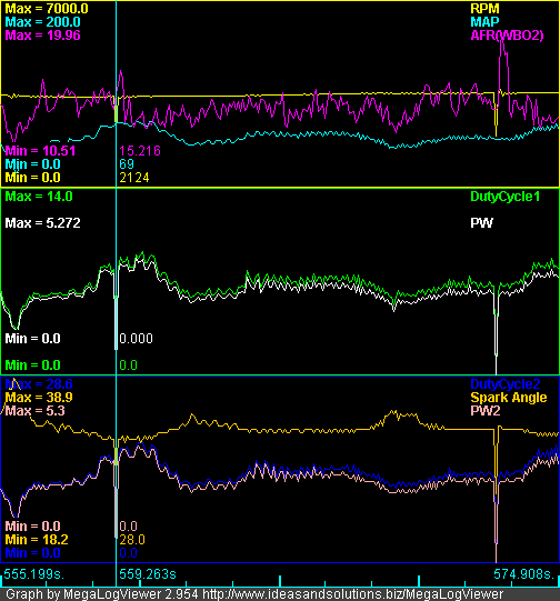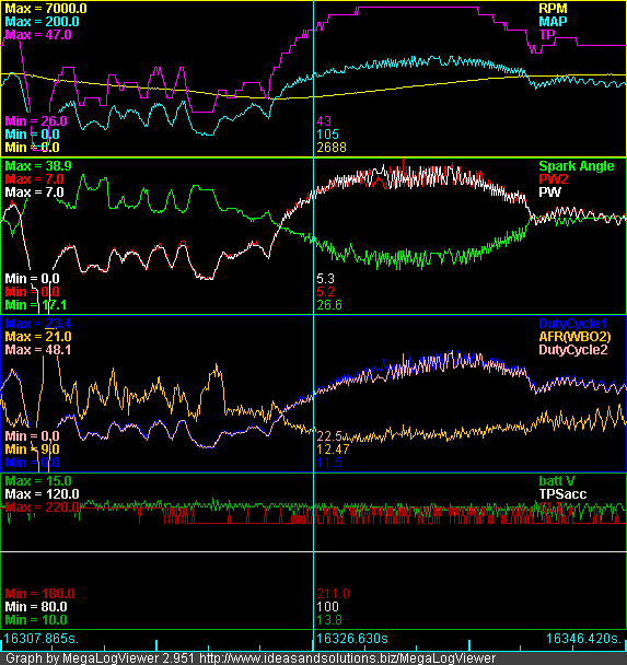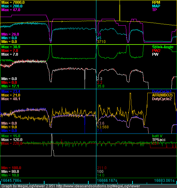 Not sure it helps the diagnostic but the car is a 91, 1.6 (Rebello engine), 550 injectors, MSPNP9093 (cap mod, tps mod, mapdaddy sensor) and a bunch of other stuff.