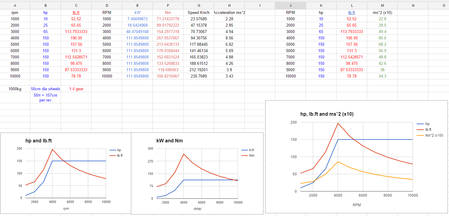 If that paragraph confused you, think about it this way. Let's say you have a hypothetical car, and it's operating in the hypothetical universe we're talking about (no aero drag, no rolling resistance, no drivetrain losses, perfect efficiency). It is making a flat 10ft.lbs of torque at the flywheel, regardless of engine speed. (It's a very small engine, able to rev infinitely high.) At 5252rpm, you have 10hp available to you. At 52,520rpm, you have 100hp available to you. Will the car not accelerate harder with 100hp than it will with 10hp?