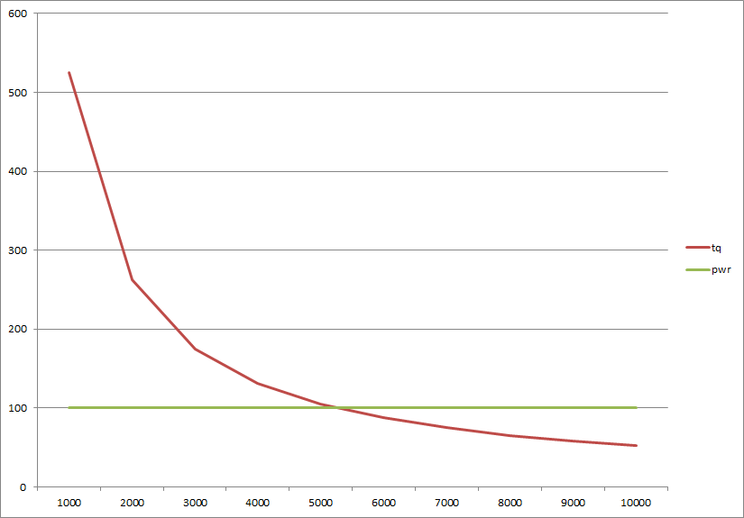 If power is flat from 5000rpm>10,000rpm then torque is halved at 10,000rpm.