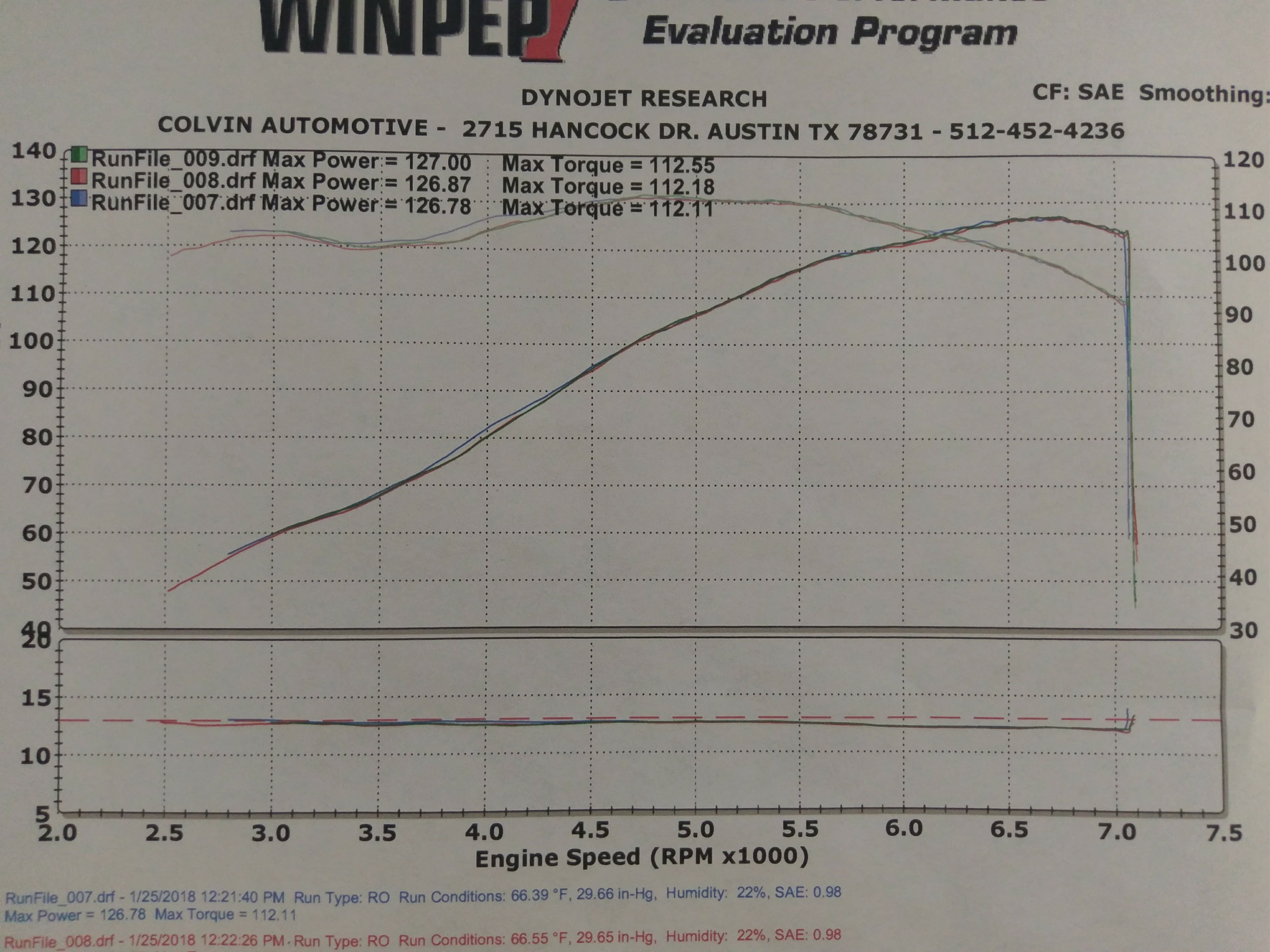 Didn't have time to dial in tune before going to dyno and it shows, but still expected a bit more than this. Running rich appears to be REALLY choking down the power. I actually leaned it out slightly before making the three verification runs and picked up an insta 2whp, so I'm guessing I need to push it up closer to 13.0. Also need to fix/replace the vacuum nipple on the VICS switch. Tried to rig it up for the dyno sesh, but it wasn't closing the butterflies, so zero torques. Less than my BP05 made, lol. I know it's actually working though b/c I can hear the vacuum leak if I tell it to close the butterflies, so at least I can follow directions on how to use EBC output for VICS, yay!