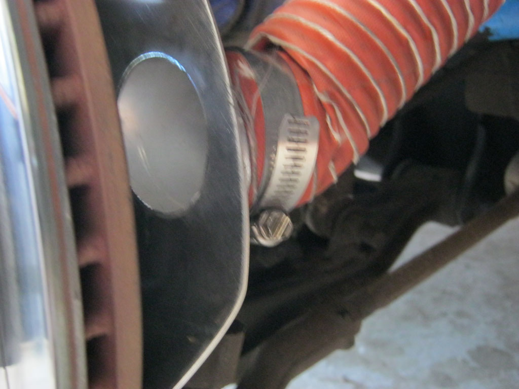The final install presented one major problem, in that the FM-supplied hose was ever-so-smaller than the neck on the TSE ducts. I finally solved the issue by removing a few coils of the inner "spring" winding, which allowed enough clearance to install. The other end connected to some plumbing adapters procured from Home Depot Motorsports (TM), which were screwed into my front air dam.
