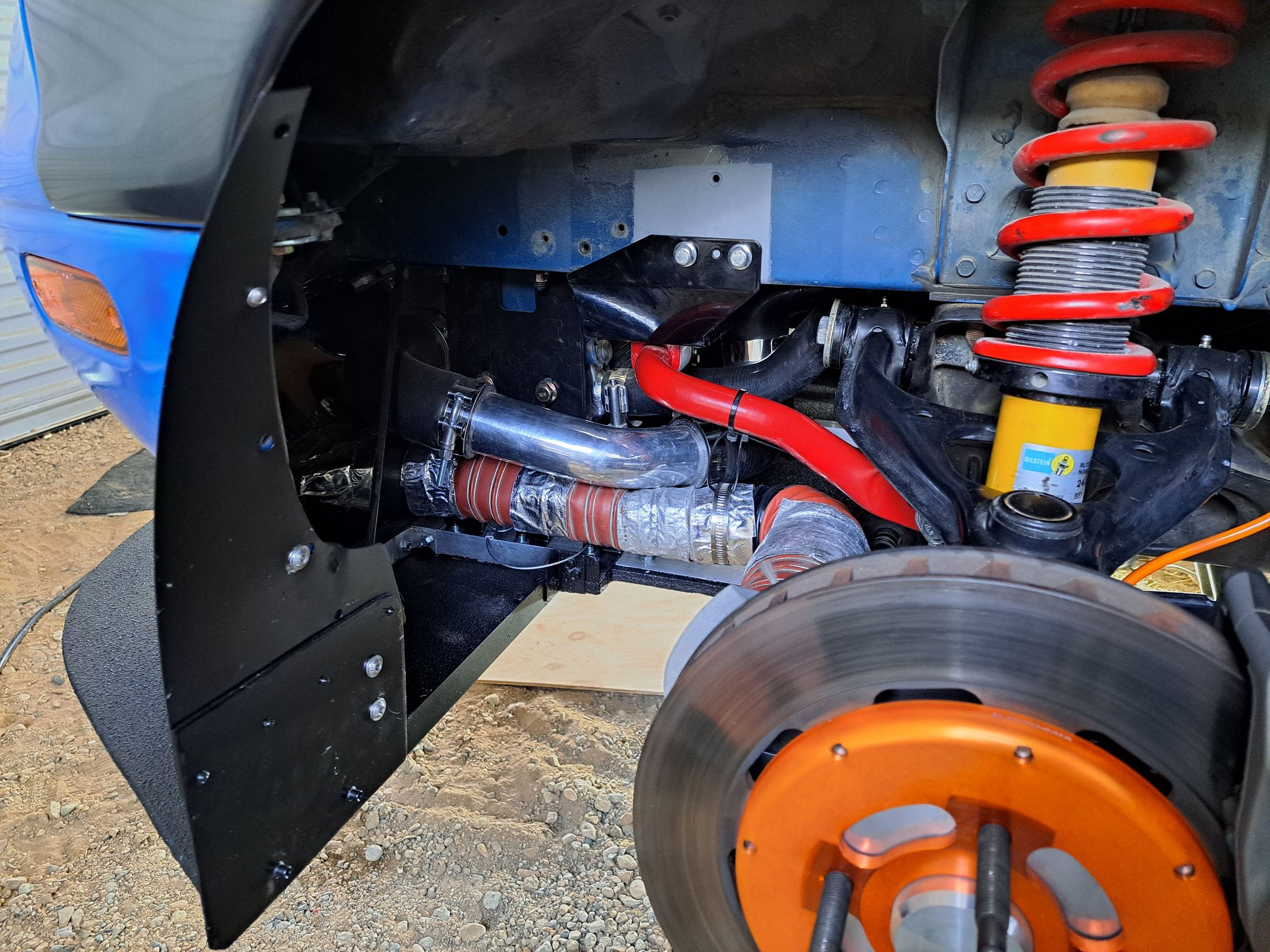 NA with ply splitter/poly airdam and Singular backplates. 3" ducting. I ziptied mine to the splitter brackets and sway bar for support. I ran the zipties through vinyl tubing to protect the ducting material. It's held up pretty well for going on 6 years.