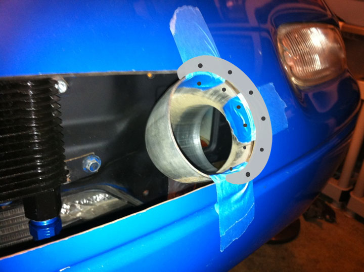 Heavy aluminum flashing in a partial circle flange, with tabs bent along the inside radius to rivet to the outside of the mouth of the inlet. Flange could attach inside or outside the bumper cover, but outside might offer better resistance to the air pressure.