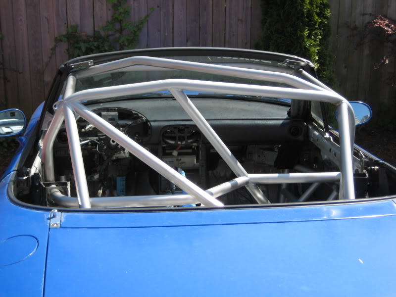 I had a hard dog cage before I made my own and grew to really dislike it. One of the main reasons was the fact the main hoop didnt extend down to the floor. Using that type of main hoop design really screws up your options for door bars. Either your ingress/egress sucks, or you wind up having some ridiculous s-shaped bends in your doorbars. With the way I bent and placed my main hoop the very top of my Kirkey hits the rear diagnol support bar before the seats shoulder bolster makes contact with the leg of the hoop. This is with the seat almost touching the rear bulkhead/firewall. This is probably the roomiest cage I have seen in a miata while fully abiding by the scca's cage rules.