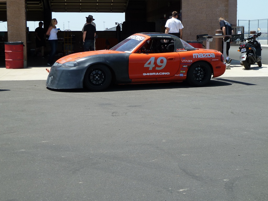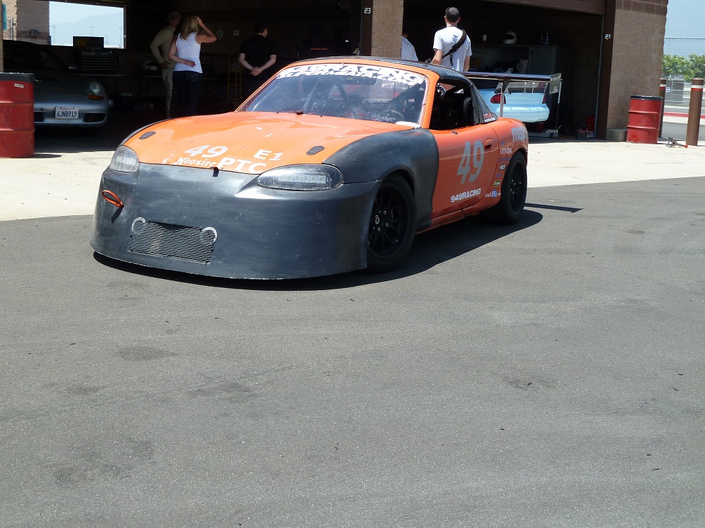 Some pics from testing at ACS last weekend. Nose and fenders are Kevlar/FRP. Not pretty but very low drag and generate a bit more downforce. The nose is rounded to get more air around the sides and less over the top. Even so, the nose seems to make the wing work better. My guess is there is less detached flow over the hood now so the air going over the roof stays a bit more attached. That in turn feeds the wing slightly higher pressure and more coherent air mass. The aero balance was good with this set up. We experimented a bit with diff set up and went backwards there however. We had a bit of power oversteer at small throttle openings and this car isn't making a lot of power.