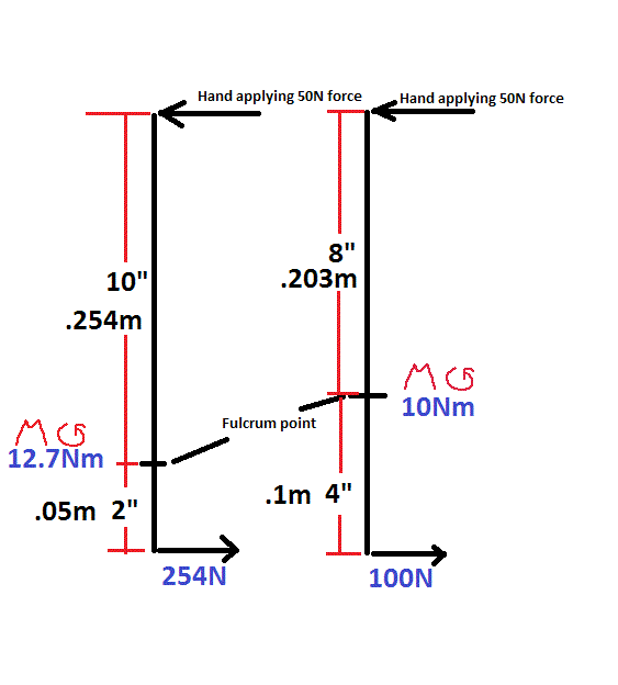 Top part (hand to fulcrum) is 10"(.254m), bottom part is 2"(.05m)