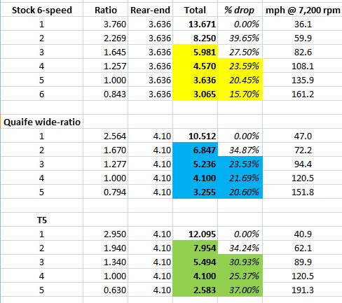 There is talk of a T5 conversion. Sav dislikes the gearing, which is fair enough when you're racing competitively. Mine is primarily a daily-driver that is tracked for funsies, so chasing that last second is of secondary importance to reliability. Comparing speed in gears (with the same 4.10 rear-end ratio):