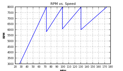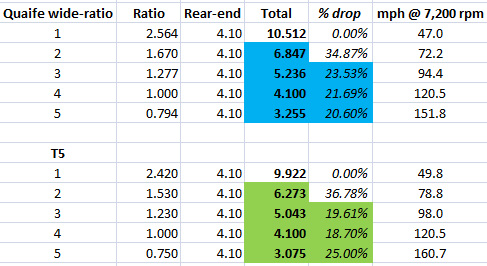 I switched the overdrive gear for a compromise ratio that will be livable on the highway. As you can see, it's a close-ratio gearset (approx. 20% drop in the middle gears) that closely approximates that of the wide-ratio Quaife. Second gear is even better and is close the the magical <6.0 total ratio that Savington deems desirable. If a road racer specs the 0.82 overdrive gear, the drop is 18% and speed at 7,200 rpm is 147 mph.