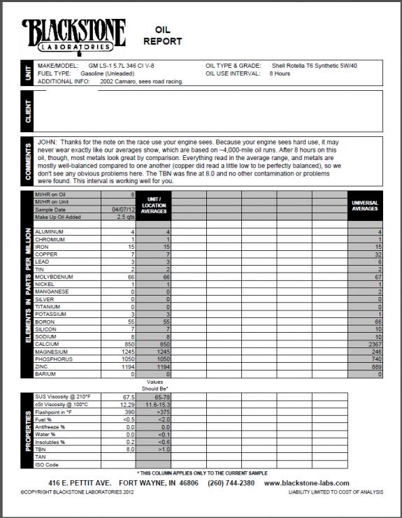 About a week ago I changed the oil in my track car and decided out of curiosity to send an oil sample to Blackstone Laboratories for used oil analysis (UOA). The results just came in this evening so I am sharing for those who may be interested, like the other UOA geeks.