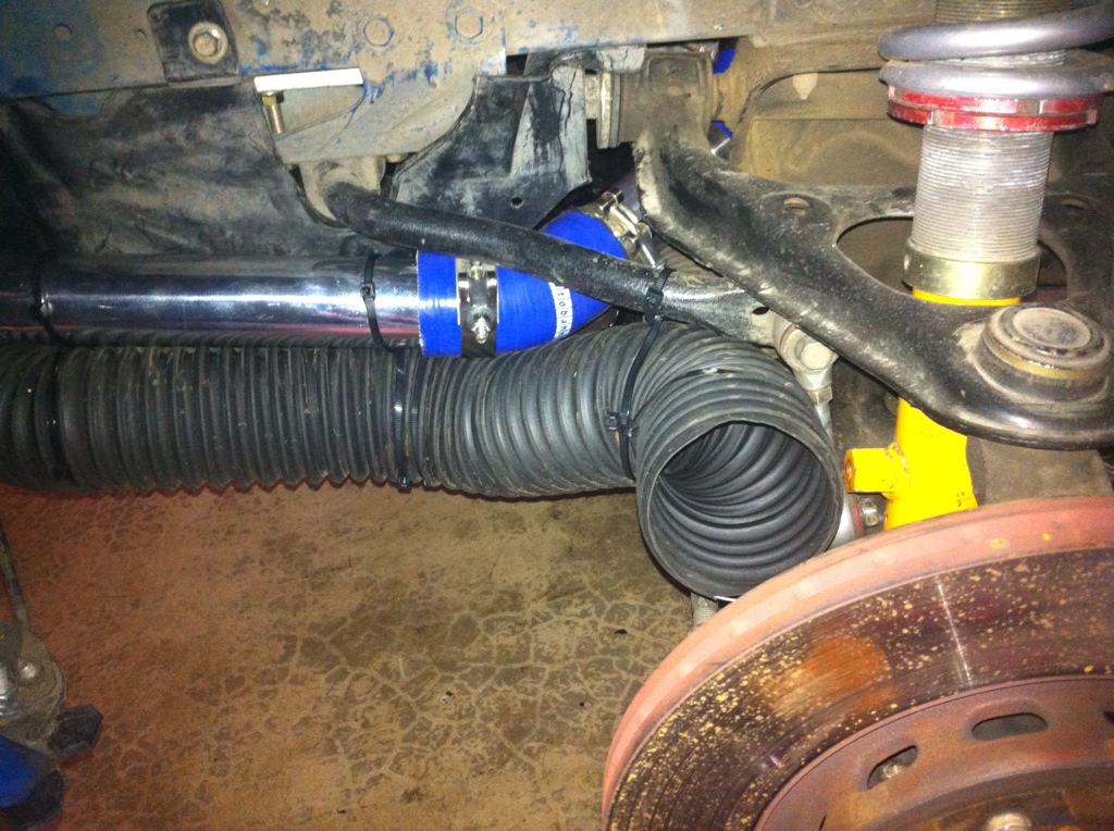 My plan is to buy some "fire proof" flexible metal ducting and "funnels" from Home Depot Racing. Cut holes in the air dam, rivet the funnels to it, hose clamp the ducting to the funnels, zip tie it along the lower a-arms, and point it at the backs of the rotors (after cutting off the dust covers)