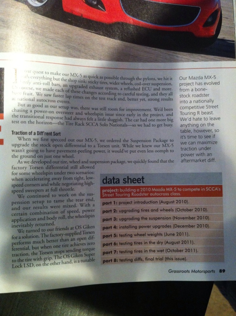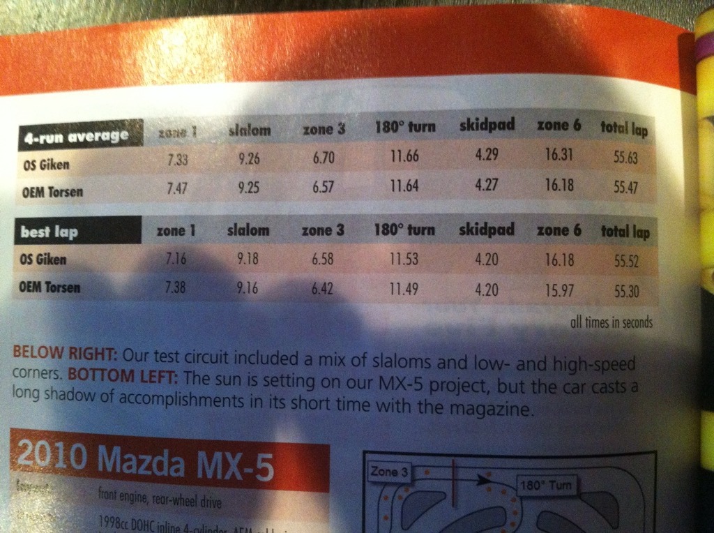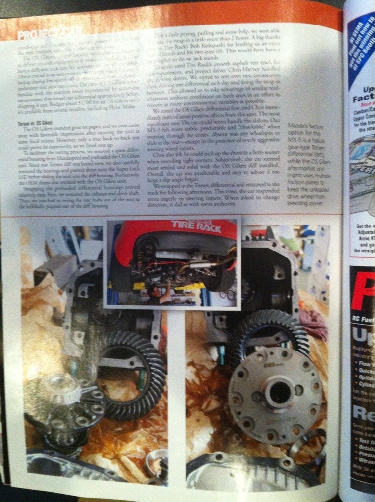 I have never read the NC MX-5 GRM article about the Giken diff, but wouldn't be that surprised to hear that the car went slower than it did with the torsen. A good friend put one in his NC track car and it destroyed the handling. Car became nervous, loose on entry, tight on exit. I drove it and it was a disaster. He swapped the Torsen back in and the car immediately went back to awesome. I know saying anything unfavorable about the OSG diff on these forums is blasphemy, and will immediately call my driving skills and sanity into question (not that they weren't already), but I had the same experience with the Giken in my NA. Since I'm going to move to a different final drive, I'm pulling the Giken off the shelf and giving it 2nd shot. There are too many positive reviews to make me think that the diffs are not great, but I wonder how many successful drivers are running them right out of the box and how many are spec'ing them to taste. The specialist that is doing the work for me is going to change out the stock Giken springs for a stiffer set, which he says he does for just about every Giken diff he sets up 'because the off-the-shelf Giken 'tune' seem to be better tuned for drifting than road racing'.