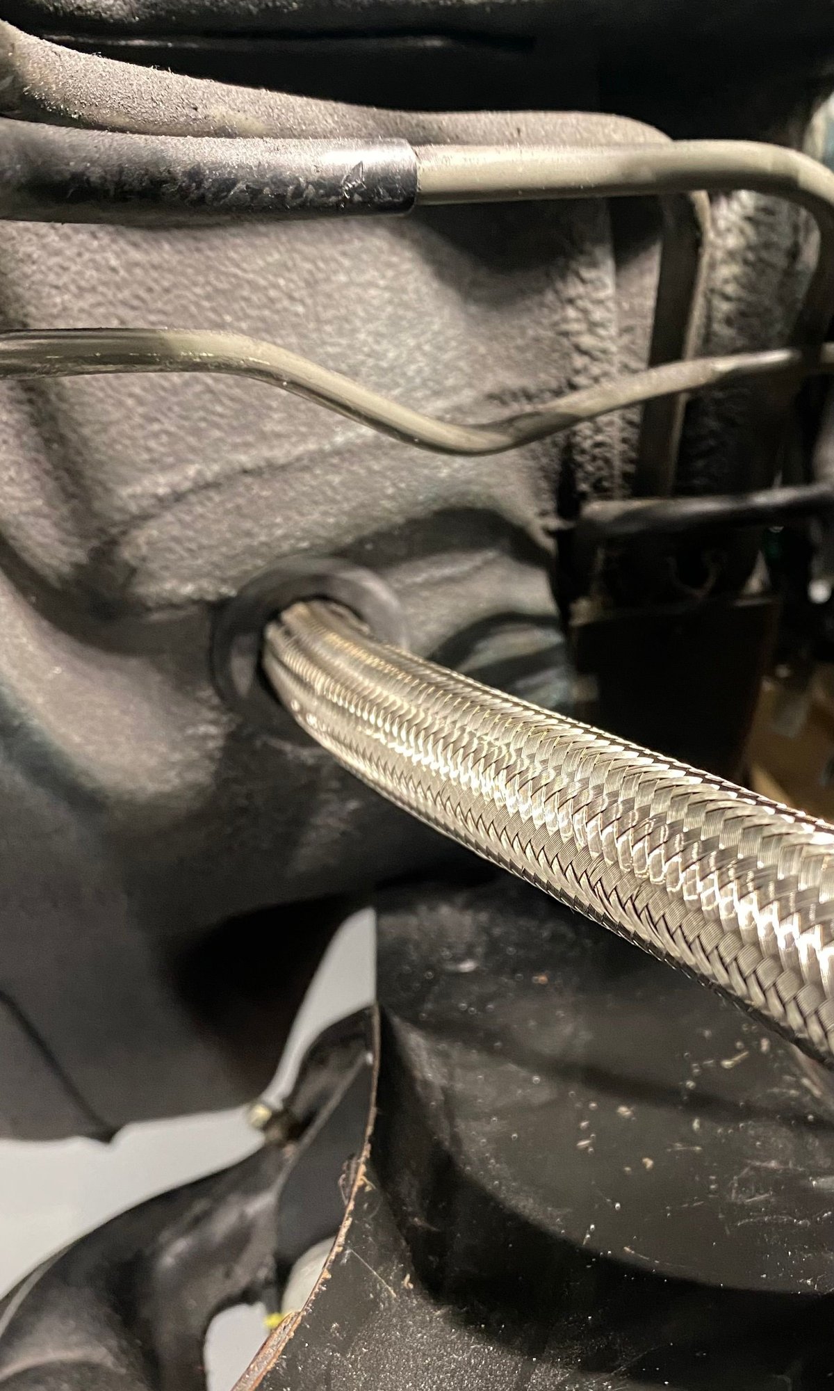 Figuring braided SS line would run forward through footwell and firewall. This necessitated a 1 1/8" hole through 2 layers of sheet metal. The metal is stupid thin and easy to drill w a sharp hole saw. Really a case of measure 15 times, drill once. If I did it again, I would have gone about 1 inch lower, but have to avoid cradle mount bolts and ABS lines as well as fuel lines.