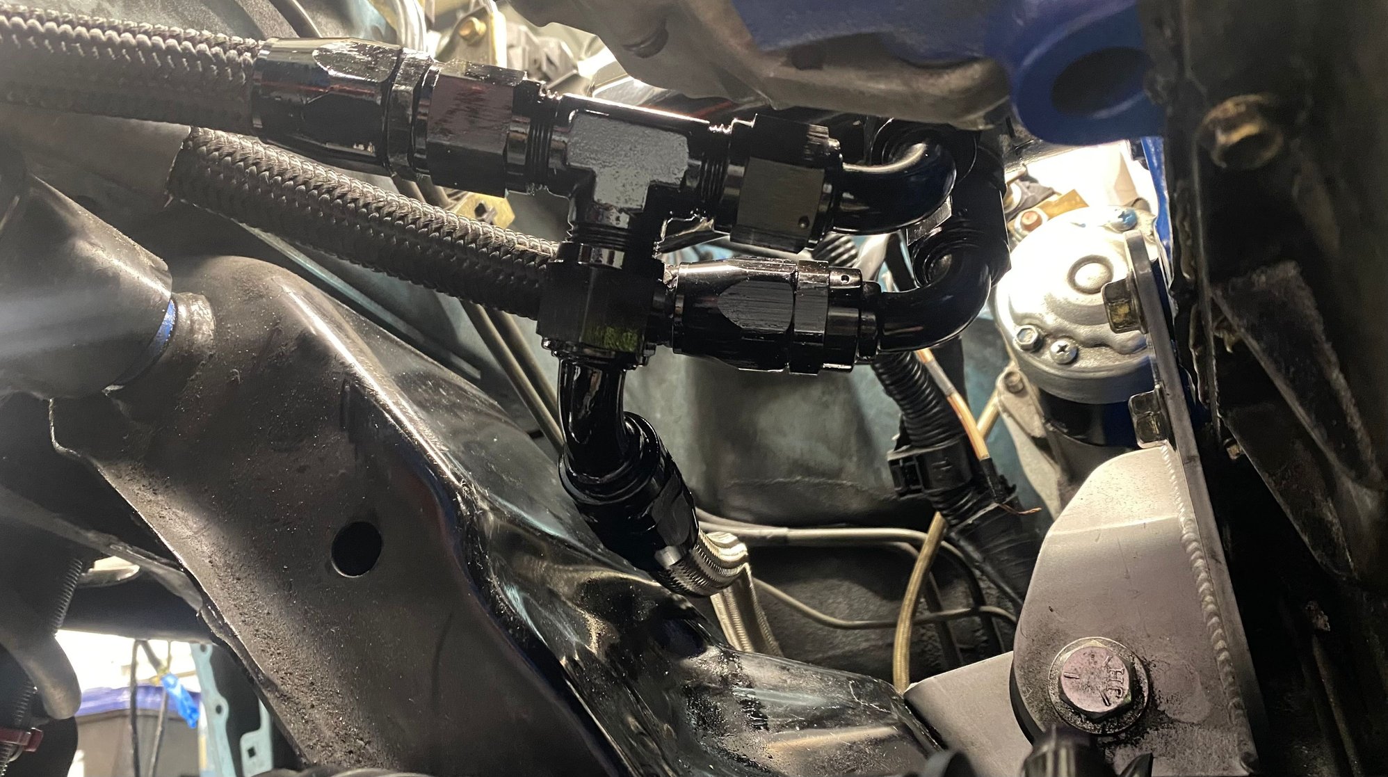 I am already running a very large Setrab oil cooler off a thermostatic plate, so had to splice into the return line with some very creative RaceFlux fittings compliments of Improved Racing.