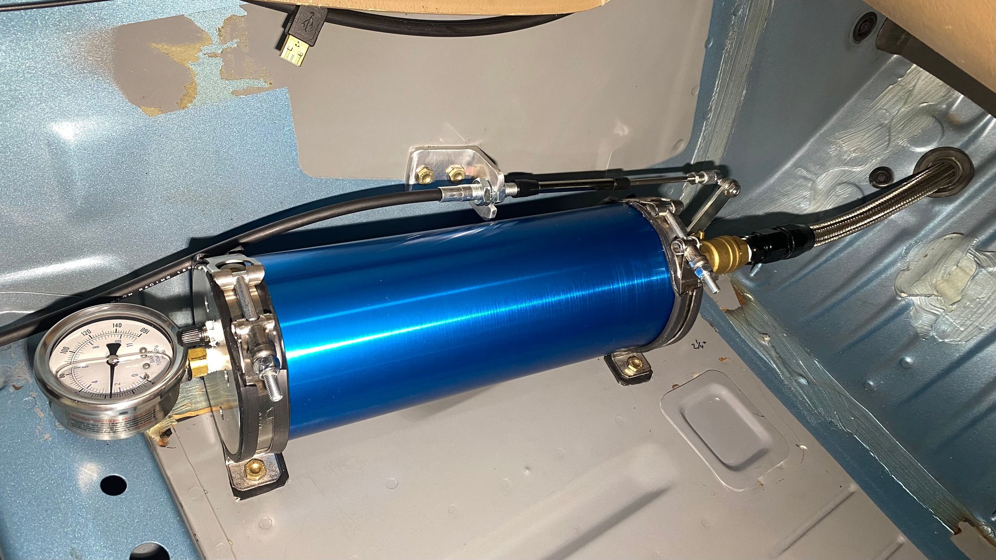 Decided on a 2 Qt. Canton Accusump fitted in the passenger footwell where I could see the pressure gauge, and use a manual shutoff. Line has to be braided stainless in cockpit instead of my normal lightweight nylon braid due to ruleset.