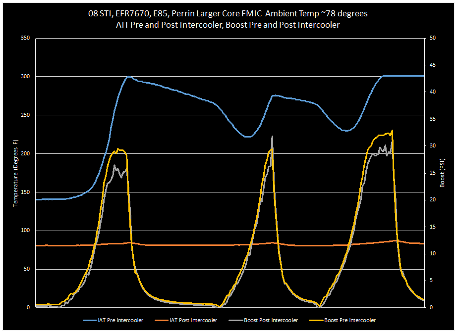 Last time I measured my IAT at the track, I got it up to 160f @ 14psi and it was also probably 90f ambient air temp. Temp sensor end of my larger crappy ebay intercooler.