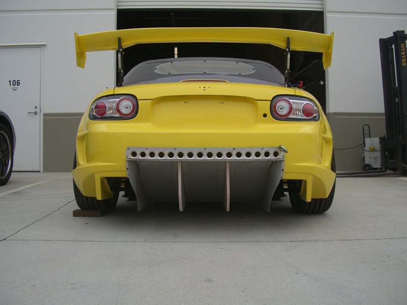 Brian Goodwin's race car is also shown from the back. He's got a full flat bottom on his car and he says he notices the downforce going over the start/finish rise at Laguna Seca. Our extends beyond the rear bumper, and has a gap between the bumper and the diffuser to prevent the rear fenders from catching air.