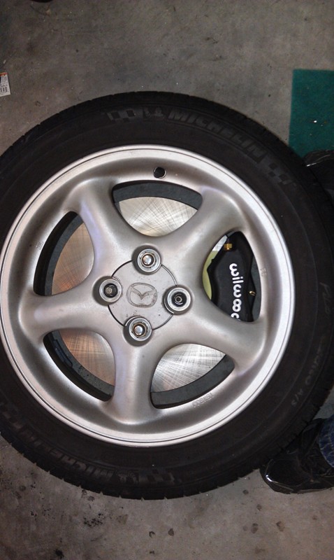 I picked up a 11.5" Mini rotor this morning and mocked it up. It does not look like the Wilwood caliper will fit under the 15" NB wheel without at least a 3mm spacer. I am sure I could pull it off with 5-6mm spacer since it clears the wheel radially but rubs agains the back of the spokes. The radial clearance is only about 1/16", a spacer might increase the gap a little, but I doubt it would be too much more. The 11.5" rotor is like 2-3 lbs heavier too. I don't think it will be worth it. If you want bigger than 11" it is clear that TSE and 949 have the only answer with their 11.75" kits.