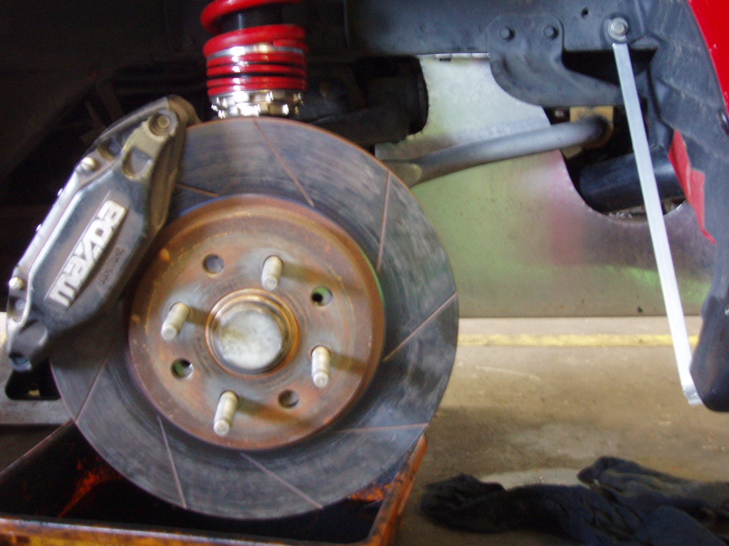 FD rx7 calipers 290mm rotors, work very well, not worth effort now, they are mounted on a simple dog bone mount, machining the out side radius of the caliper is required to fit inside 15'' wheels, and wheels have become an issue how, would really like some 9'' 6UL's but the caliper is to bulky and hits the back of the wheel spokes, would need 1'' spacer, it's just not going to work. I can see a Willwood kit happening soon
