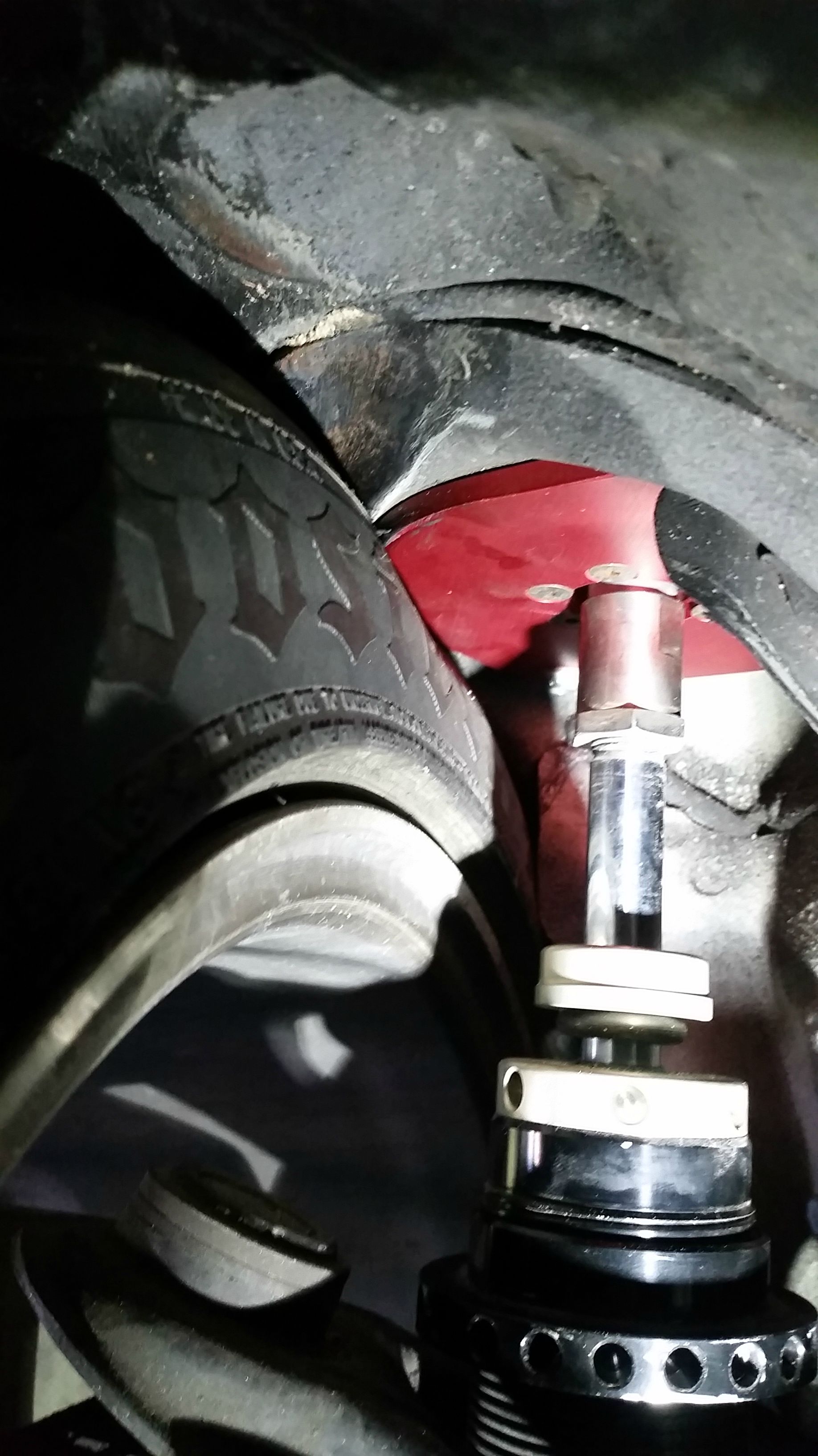 This is the tire under full bump and with as much turn as I could get out of it. At this much steering angle it is pushing the shock down so this is not full suspension travel.