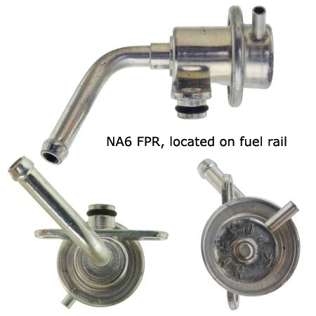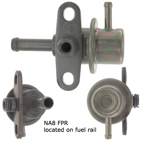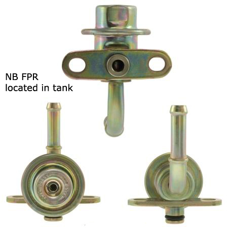 Not sure how many, if any have done this.. but it works. We were recently tuning an NA8 chassis with an NB1 motor/injectors on the stock fuel system for E85. Power goal was 140whp. We ended up running out of injector at just past 140whp. So we stuck an in tank NB FRP (60psi) onto the NB1 fuel rail for the return type NA8 fuel system and voila, 60psi. No reference port nipple so you might want to put a piece of cheesecloth or nylon over the diaphragm housing to keep grit out of the port hole. It works because the boss on the intake FPR is the same. Total Pnp. How cool is that?