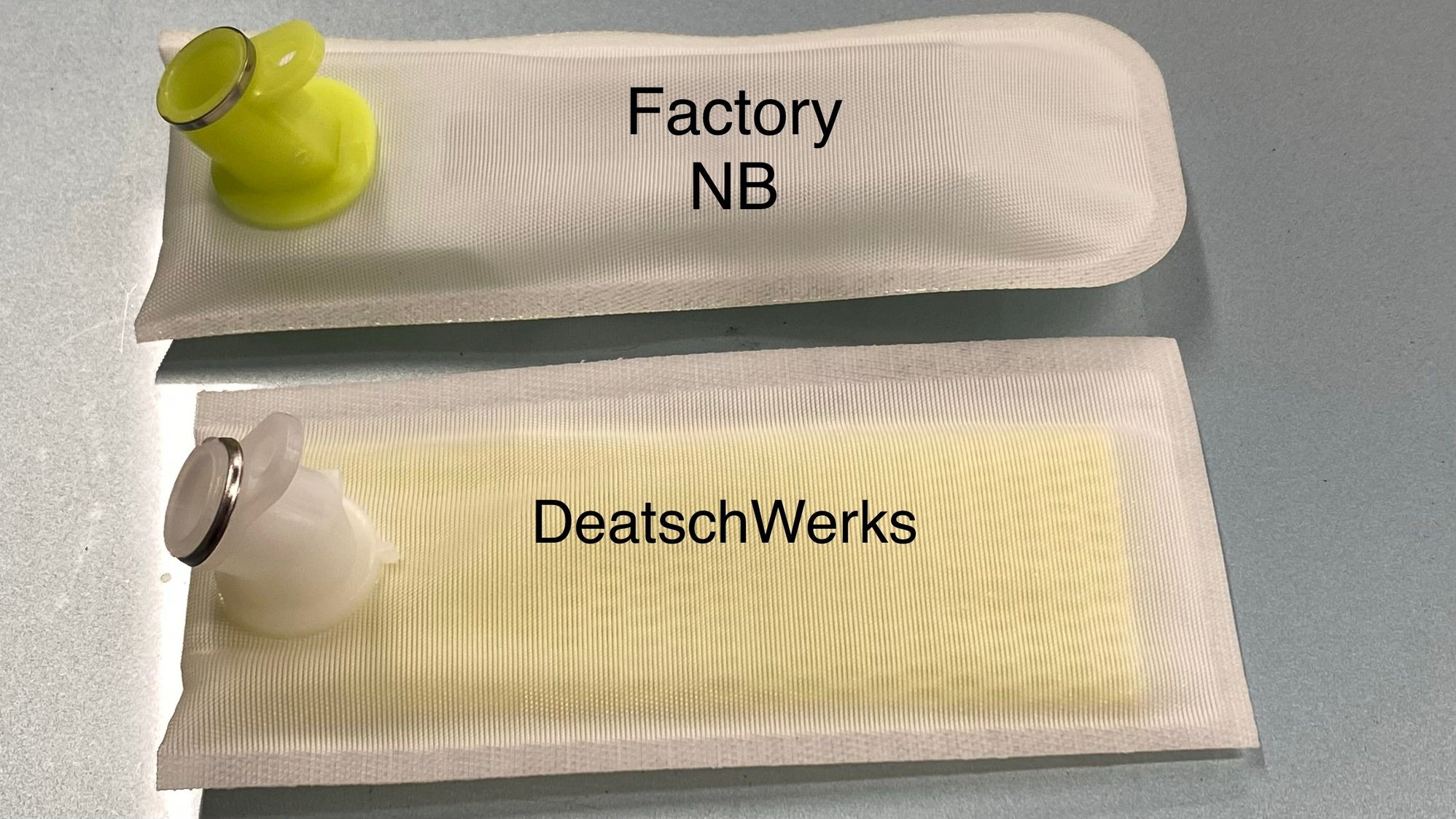 Pictured is a new DW sourced filter in the kit vs. a factory NB filter. You can see the difference's. The factory one is better supported internally, (feels more robust) and has a slightly different angle. Not to say the DW wouldn't work fine, however changing is a PITA. Don't forget the tiny washer.