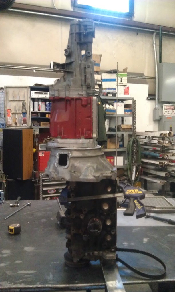 In order to index the transmission and bell housing I installed a clutch on an old block and crank. Then bolted the bell housing to the block and stabbed the transmission. The bell housing was the tacked to the adapter plate, and everything pulled apart for final welding.