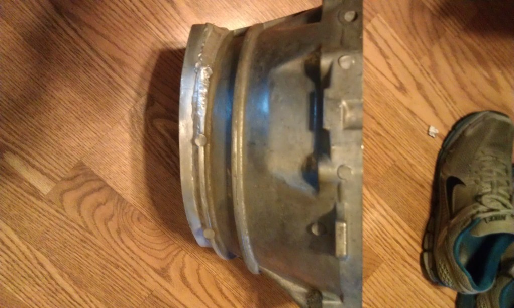 This is what I found after dropping the transmission. Broken flex plate, and a severely cracked bell housing. I decided that the bell housing could not be salvaged as the left upper ear was almost completely broken off and the hole for the location dowel was cracked and oblong.